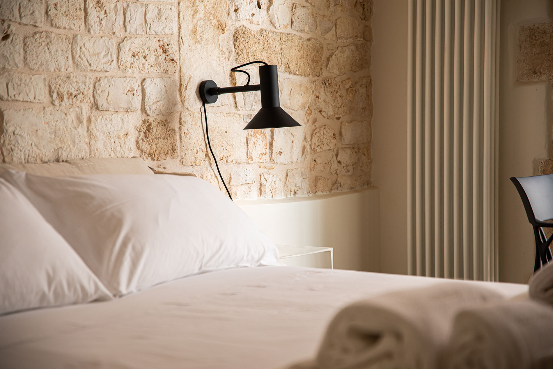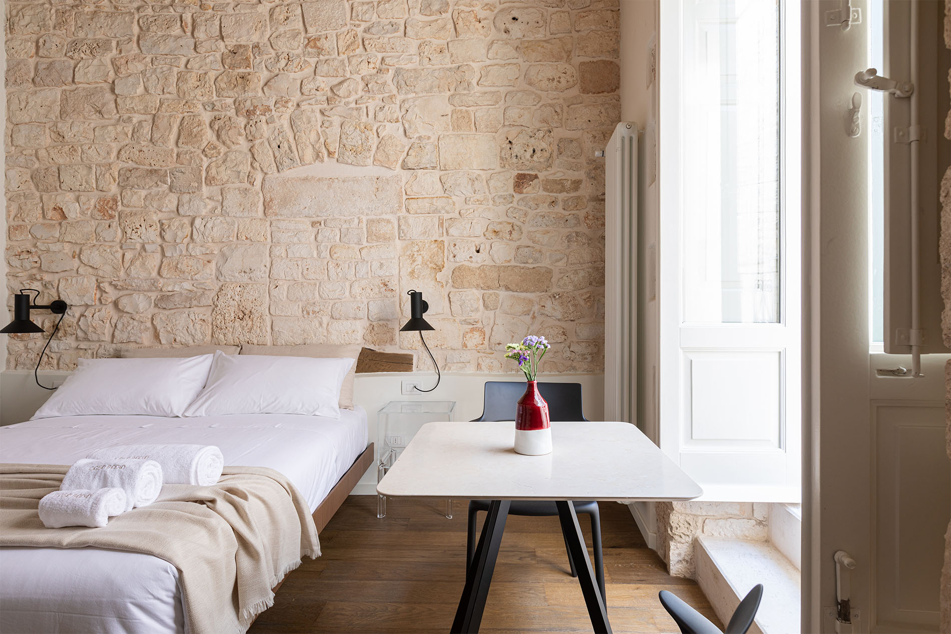 Room Chiostro, named after the ancient cloister (chiostro in Italian) of San Benedetto monastery, overlooks the stone-paved alleys in the heart of old town. In this room, distinctive Apulian dry stone walls blend with the modern interior décor, to make your stay timeless and unforgettable. Indulge in this unique and intimate room that is submerged in history and art, and wake up in the morning to an Apulian sun rise and warm breeze.