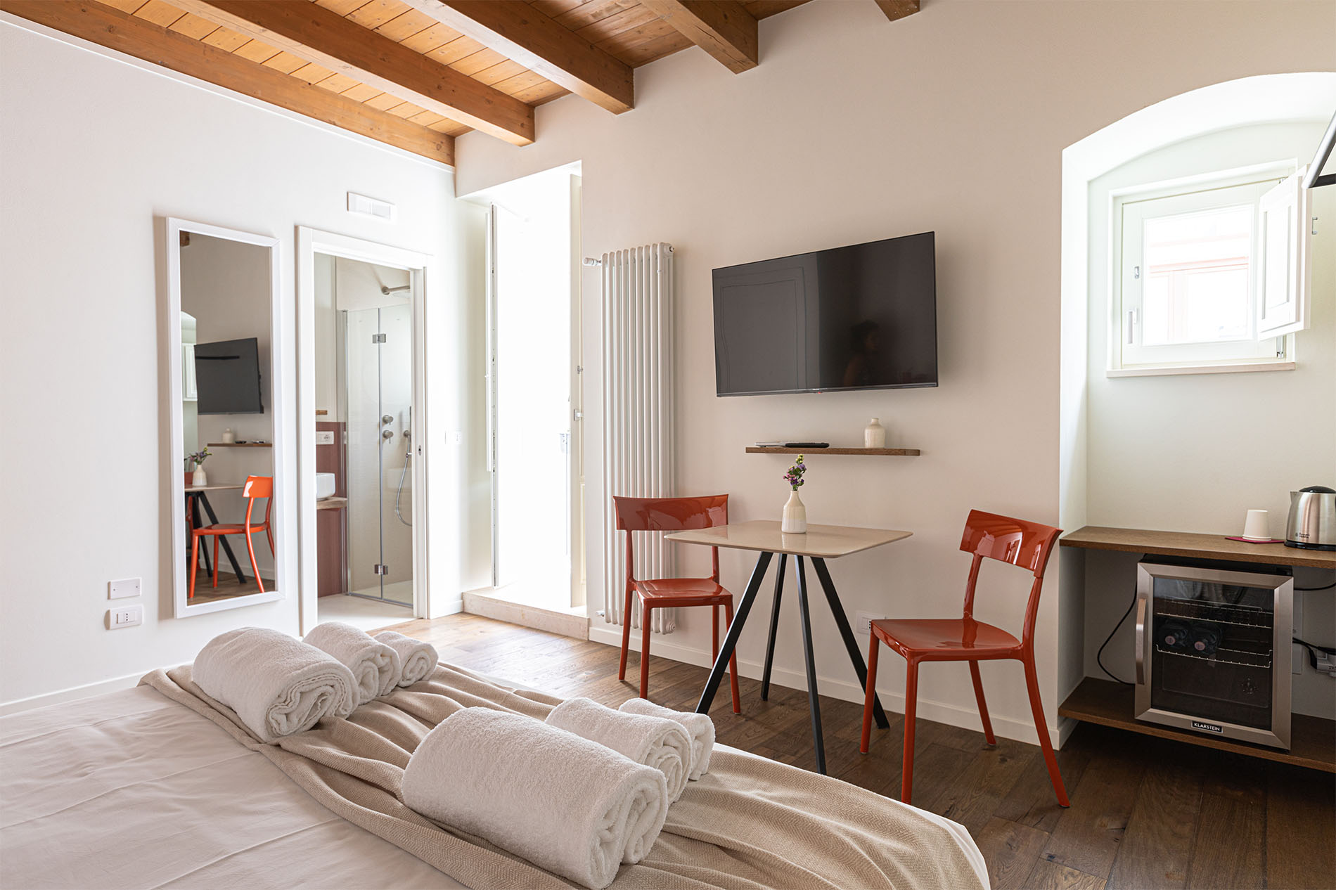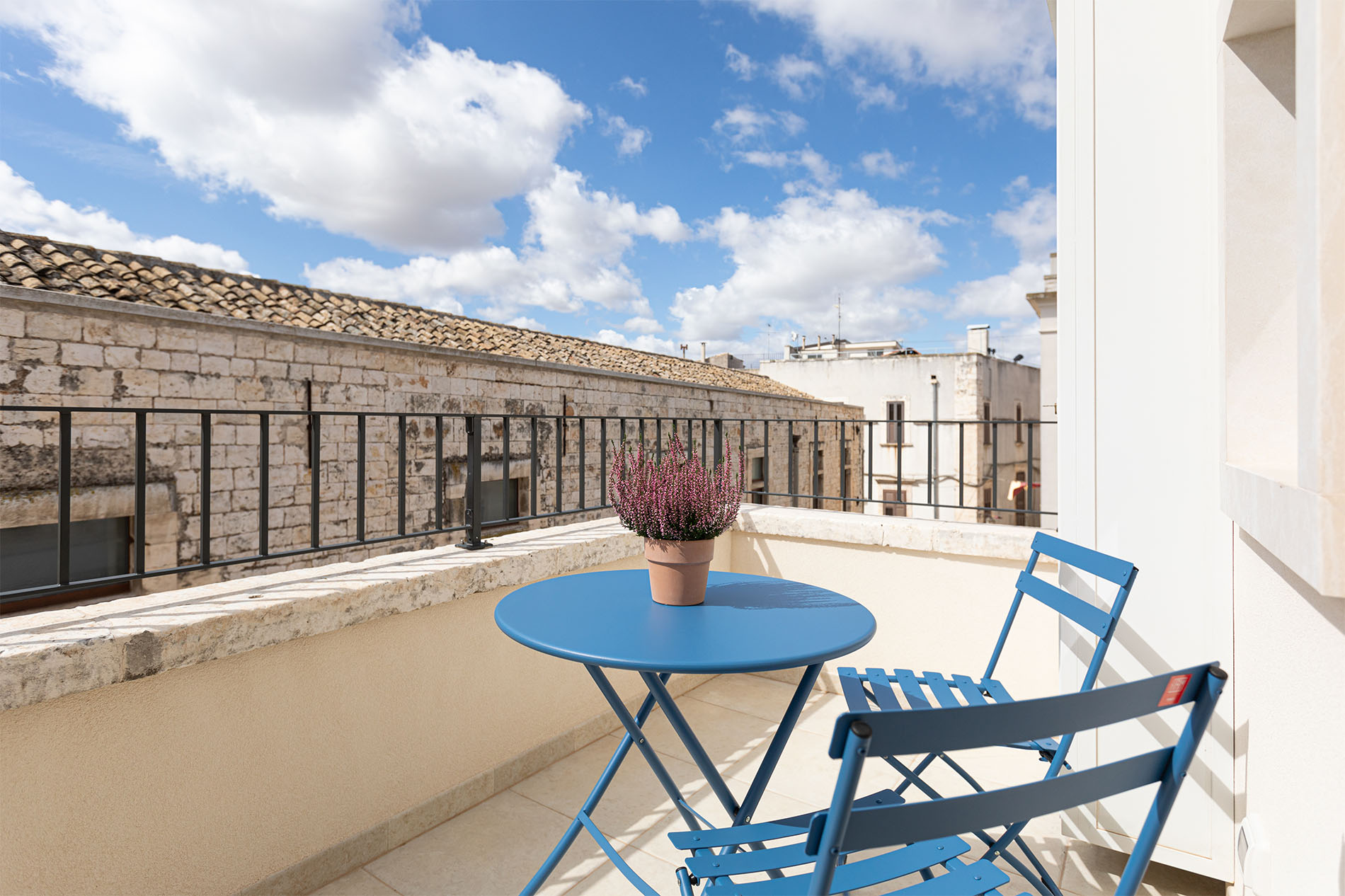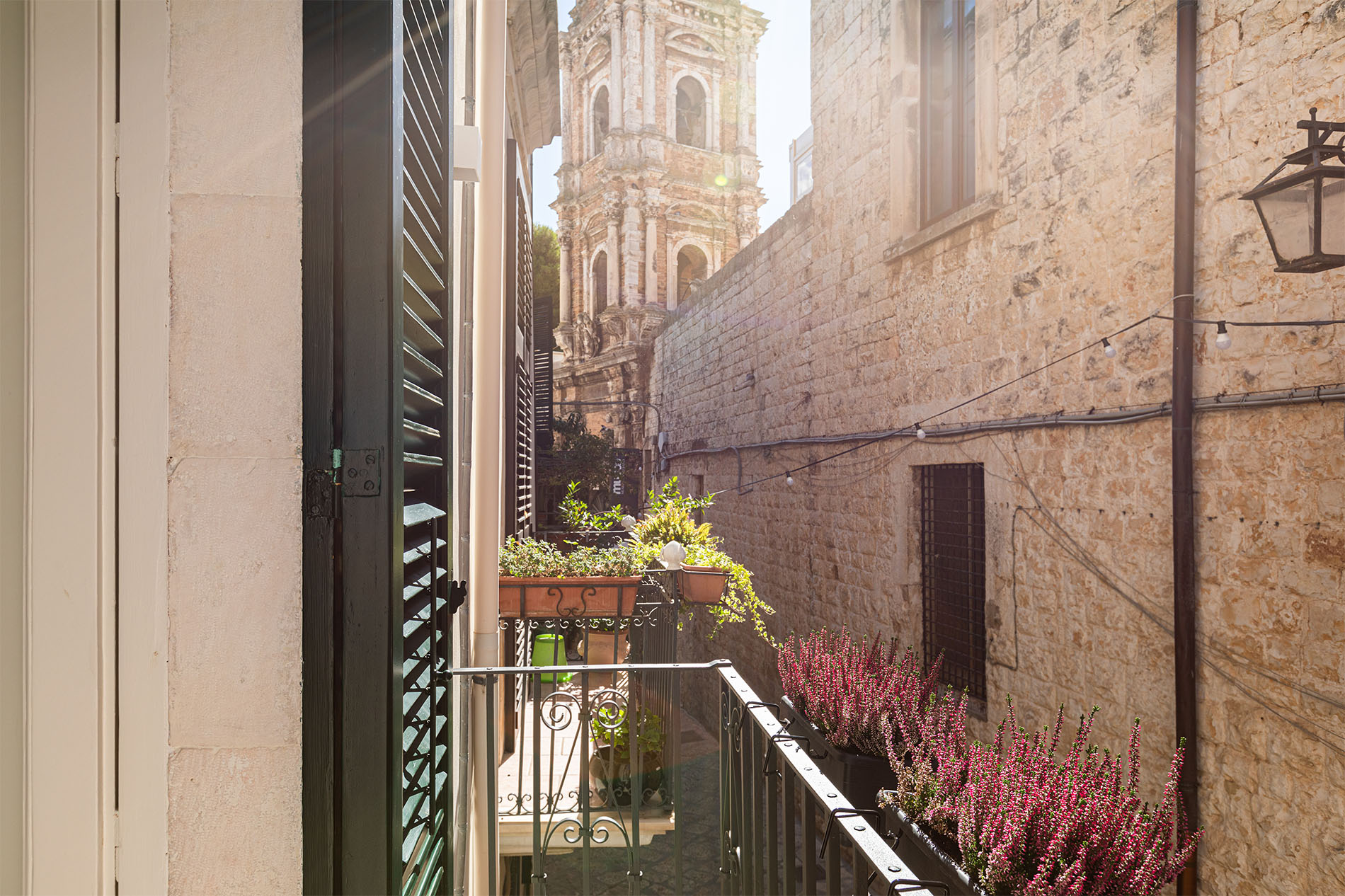 Room Aranci, whose name recalls the tiny citrus garden in the Bishop Palace next to Casa Badia, offers our guests a comfortable and elegant space with picturesque views of the San Benedetto monastery that can be enjoyed from the room’s small Apulian balcony. The perfect place to get lost in history and recharge your soul.