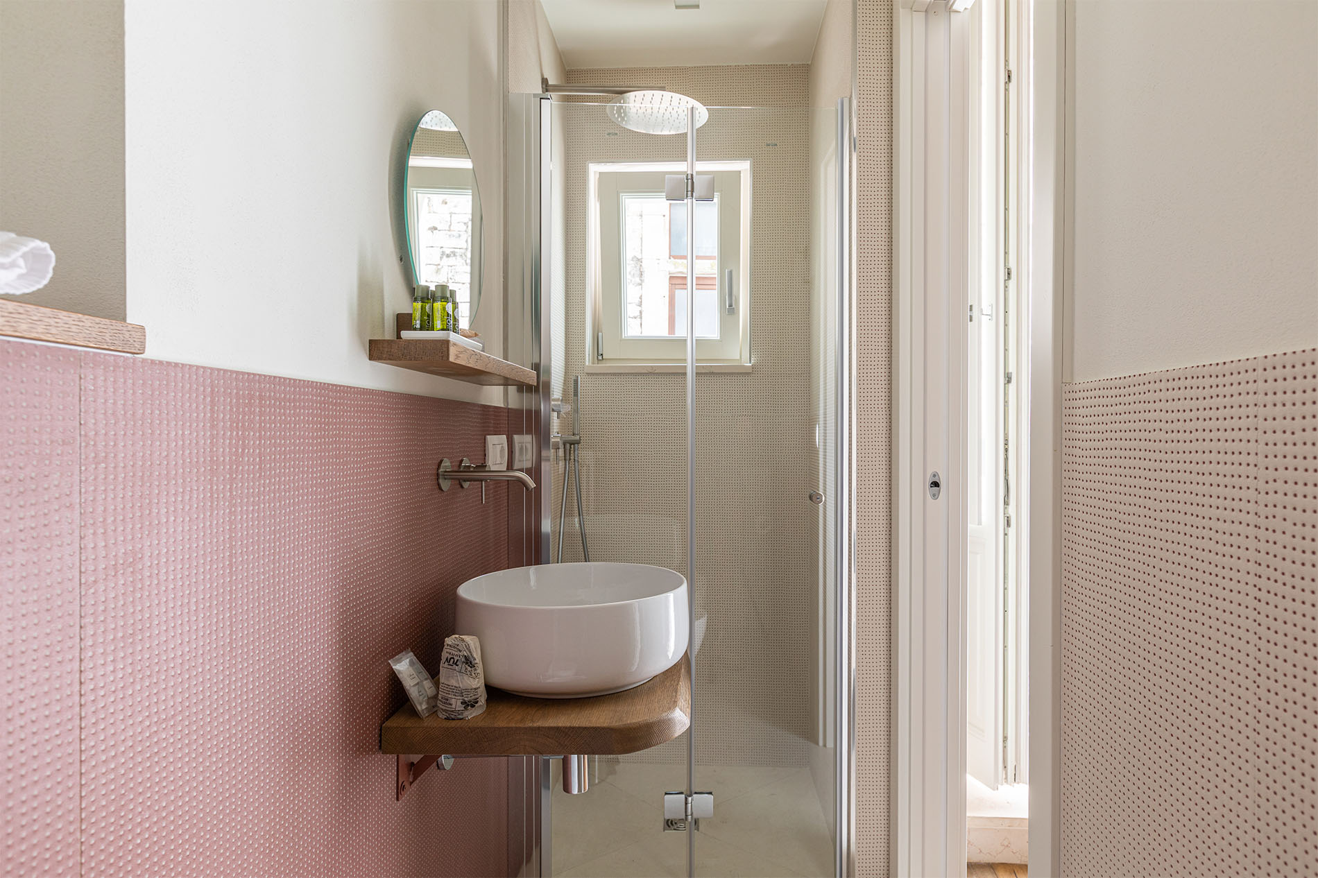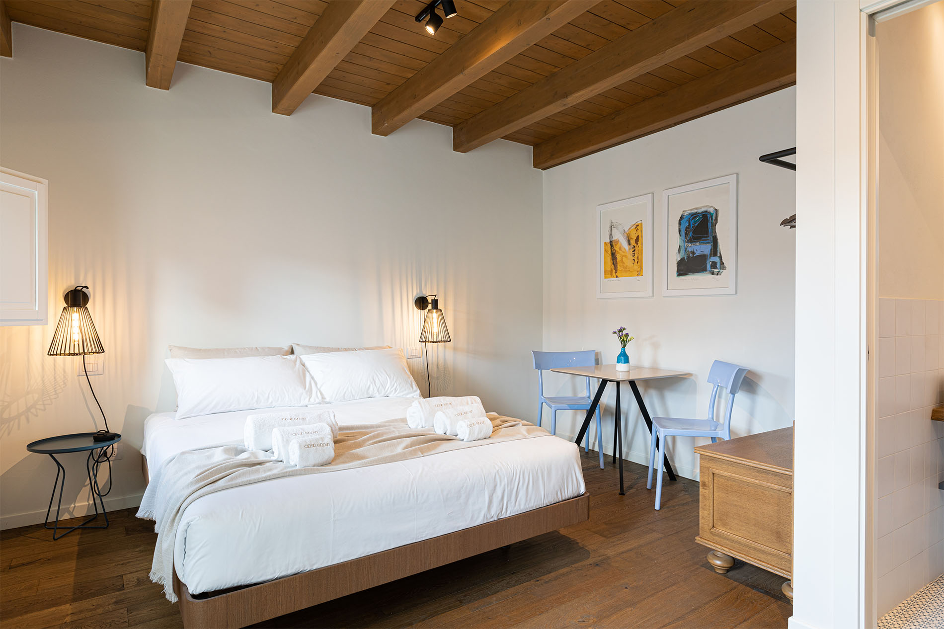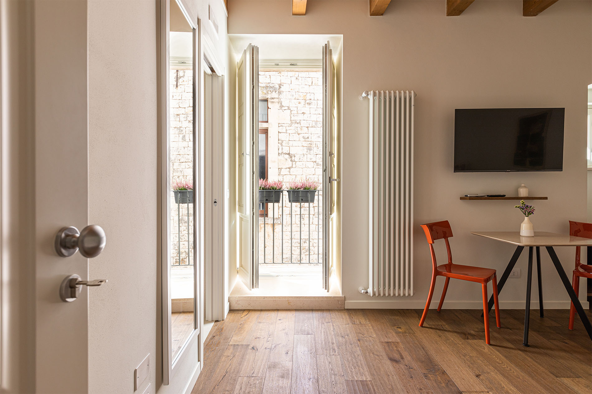 Room Aranci, whose name recalls the tiny citrus garden in the Bishop Palace next to Casa Badia, offers our guests a comfortable and elegant space with picturesque views of the San Benedetto monastery that can be enjoyed from the room’s small Apulian balcony. The perfect place to get lost in history and recharge your soul.